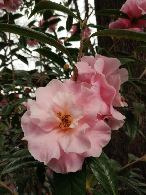 ‘金滇缘’为云南山茶和金花茶的种间杂交品种,兼具父母本的特点;株形开张,叶片长椭圆形,叶色油亮、侧脉明显下凹,似金花茶;花为半重瓣型,浅粉红色,花瓣略波曲,中型花,花芽顶生和腋生。该品种喜疏光的环境,不耐强光直射。