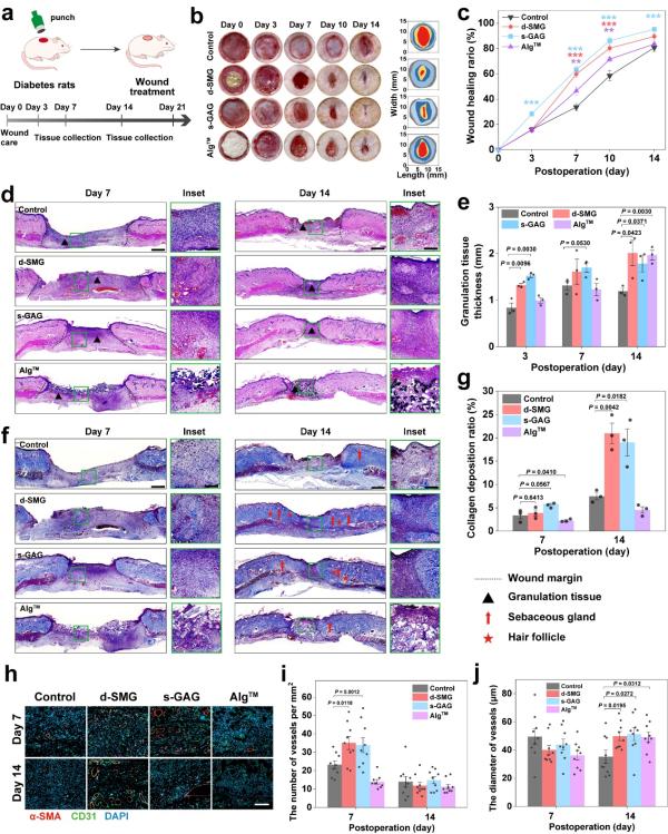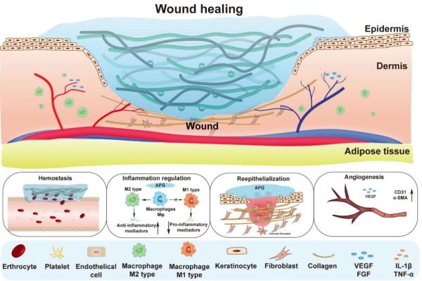糖尿病慢性溃疡是糖尿病最常见、危险性最高的并发症之一,对人类生命健康构成了巨大威胁。目前临床上的治疗方法比较局限,治愈率偏低,亟需开发新一代机制明确、疗效确切的新型药物。吴明一研究员团队研究发现天然多糖SG108显著促进急/慢性伤口愈合,增加创口部位的肉芽组织再生、胶原沉积以及新生血管,并显著下调组织中TNF-α、IFN-γ、IL-6等炎性细胞因子表达水平,效果优于临床上广泛使用的贝复新与藻酸盐敷料(Nat. Commun., 2023, 14, 396; Carbohyd. Polym., 2025, 348, 122900)。药理机制研究发现,该多糖能够使巨噬细胞向抗炎M2表型极化,高亲和力的绑定IP-10、IL-8等炎症趋化因子,通过减弱糖尿病慢性伤口微环境中持续的炎症反应,修复糖尿病难愈合伤口创面;研发了基于该多糖AFG的伤口敷料水凝胶SG108,其显著促进I型糖尿病大鼠与II型糖尿病小鼠伤口创面愈合(Biomaterials, 2023, 299, 122141; Int. J. Biol. Macromol, 2024, 281, 135708),是一类药效明确、安全性好、易于制备的新型创面敷料,在临床上常见难治愈的慢性创伤领域具有良好的应用前景。
