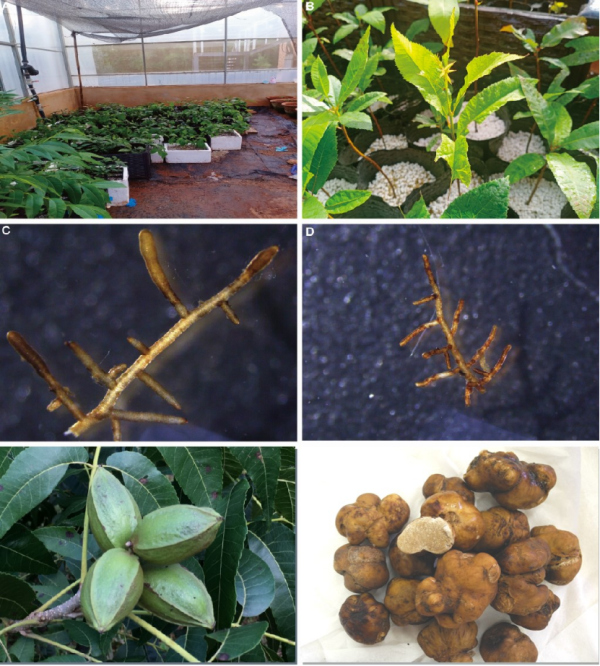 美国山核桃引种至我国已一百多年,是发展果木-食用菌立体经济的理想树种,但生产上幼苗菌根化程度低,合成菌根菌剂并应用于生产是提高其成活率的关键。项目组通过对美国山核桃的菌根真菌多样性、环境影响因子及适应机制进行深入研究,建立了美国山核桃菌根真菌数据库,挖掘出一批既有助于美国山核桃菌根化又具有较高的商业价值的菌根真菌资源。在此基础上,选用其中两种本土经济真菌(丽江块菌和云南硬皮马勃)成功与美国山核桃进行了菌根苗的合成,并获得了授权发明专利2项(ZL 2024 1 0146512.2、ZL 2024 1 0100743.X),为美国山核桃-食用菌立体经营的林下经济发展提供了新的选择。